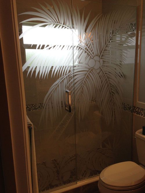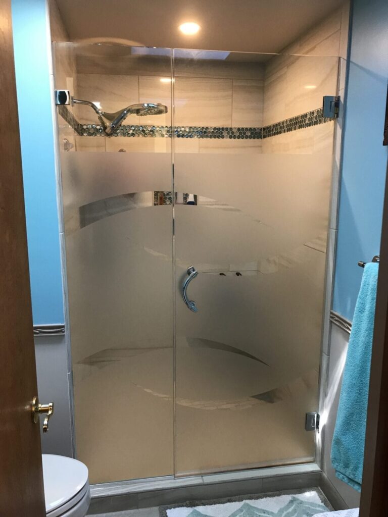 Etched glass brings beautiful patterns to glass. However, it really is not practical for an application exposed to soap, shampoo, conditioners and the oil in your skin. DecoTherm can put a butterfly into the center of your door or a field of flowers up to your neck with a ceramic frit process that emulates etched glass.
