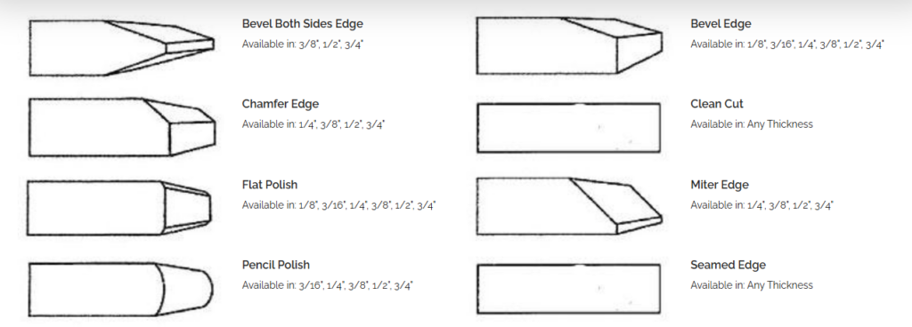 Beaded Bevel, Pencil Polish, Seamed Edge, Flat Grind, Miter, Bullnose, Bullnose Bevel, Pencil Grind, Flat Polish, OG Edge, Triple Pencil